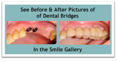 A bridge is a fixed dental restoration used to replace a missing tooth by joining an artificial tooth permanently to adjacent teeth or dental implants. There are many different designs of bridge but the most common is a fixed bridge, which is made by placing crowns on the teeth either side of the space and then joining the crowns together by placing a solid crown in the space to replace the missing tooth. Because this type of bridge uses joined crowns, cleaning the teeth in the area will be more difficult. A well-designed bridge should allow effective daily cleaning.